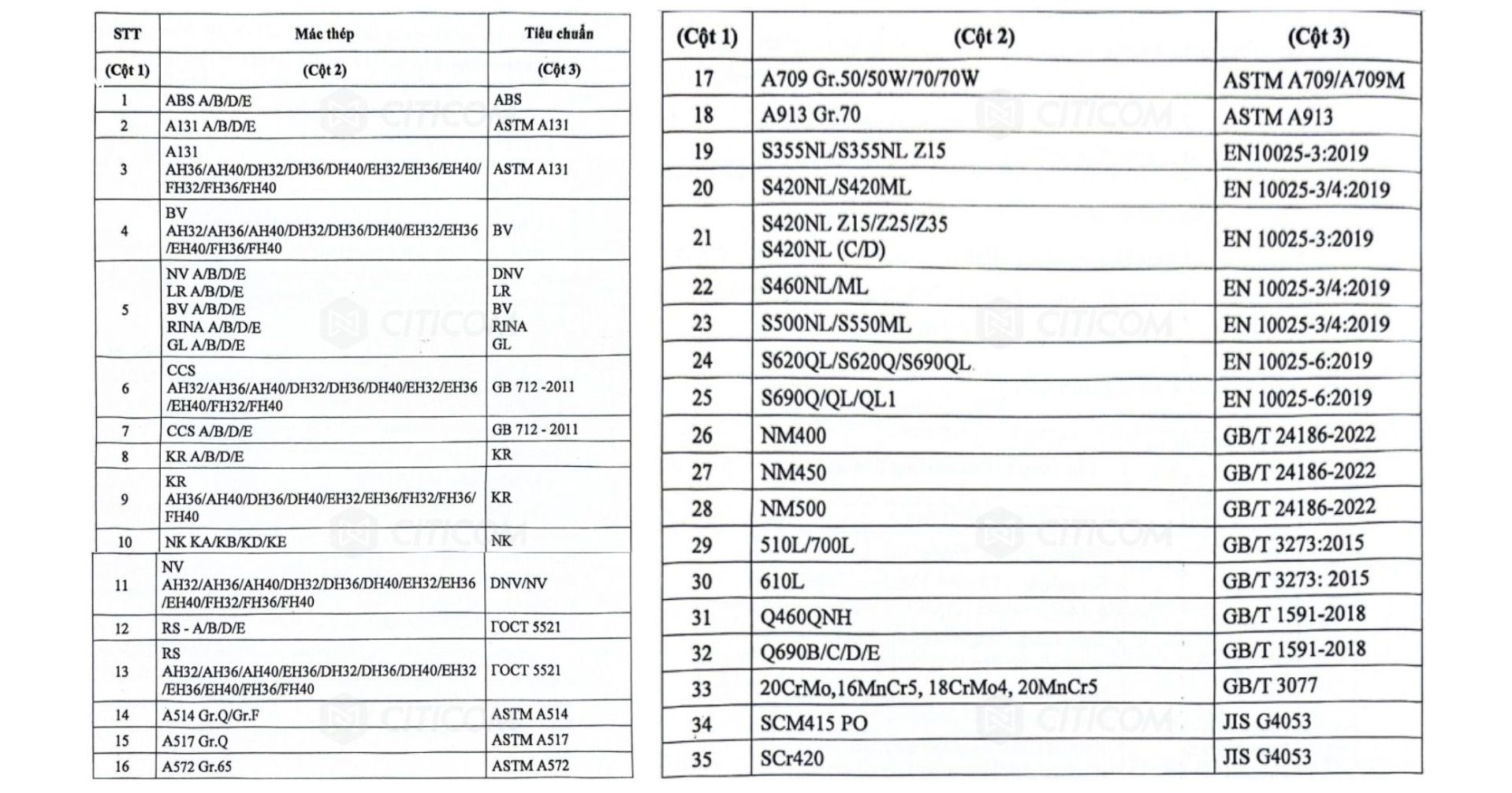 - Thép cán nóng đã nằm trong danh mục loại trừ theo Quyết định áp thuế chính thức số 1959/QĐ-BCT ngày 04/07/2025, gồm 35 loại mác thép dưới đây: