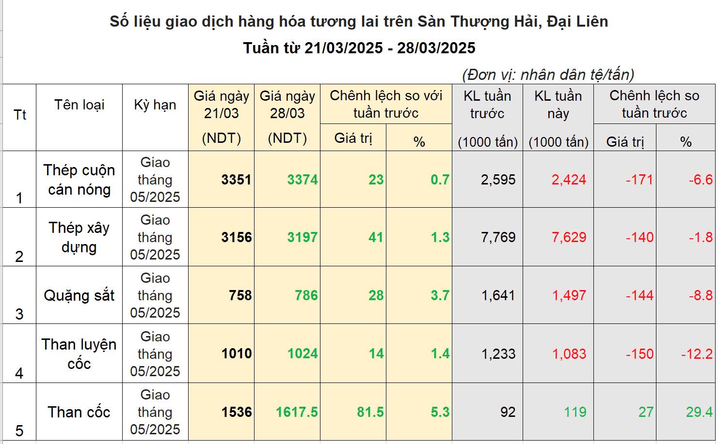 Nhu cầu vẫn yếu, cộng thêm tâm lý lo ngại và chờ đợi chính sách thuế quan của Trump sẽ công bố vào đầu tháng 4 khiến các nhà giao dịch hạn chế mua bán, tâm lý đứng ngoài chờ đợi bao trùm thị trường. Vào hôm thứ hai đầu tuần giá thép đã có sự bật tăng rất tích cực. Tuy nhiên, trong các ngày còn lại, giá liên tục sụt giảm. Giá quặng sắt và than cốc giao dịch tích cực hơn khi tăng trở lại vào hôm thứ 5 do sản lượng gang của Trung Quốc đạt mức cao. Chốt tuần giao dịch, giá thép tăng nhẹ gần 1%, quặng sắt tăng 3%, than cốc tăng mạnh 5%. Khối lượng giao dịch theo tuần tiếp tục sụt giảm. Điều này cho thấy bên mua đang thoát khỏi thị trường và đứng ngoài chờ đợi.