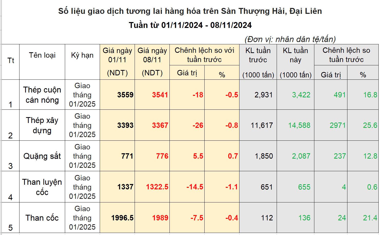 Đầu tuần, thị trường giao dịch trong trạng thái thận trọng chờ kết quả bầu cử Tổng thống Mỹ. Từ ngày thứ tư, thông tin ông Trump tái đắc cử đã khiến tâm lý thị trường lo ngại bởi những tuyên bố trước đó của Ông này về việc sẽ áp thuế mạnh hơn nữa với các hàng hóa của Trung Quốc xuất khẩu vào Mỹ, trong đó có sắt thép, giá thép quay đầu giảm nhẹ. Cũng trong thời gian này, Thường vụ Quốc hội Trung quốc diễn ra kỳ họp thông qua các chính sách kinh tế. Theo đó, Trung Quốc sẽ tung ra các gói kích thích kinh tế lớn, trị giá 10.000 tỷ NDT (tương đương 1.400 tỷ Usd) để vực dậy nền kinh tế. Tuy nhiên, thông tin này được chính thức đăng tải vào cuối ngày thứ sáu nên chưa thể tác động ngay tới giao dịch trên sàn sắt thép tương lai. Chốt tuần, giá thép và quặng sắt cùng giảm nhẹ quanh mức 0.6%, Khối lượng giao dịch tăng nhẹ so với tuần trước.