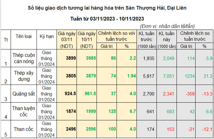 Diễn biến thị trường vẫn đi theo kịch bản của hai tuần liền trước. Tâm lý giao dịch ngập ngừng và thị trường rung lắc điều chỉnh nhẹ trong 2 phiên đầu tuần. Các phiên cuối tuần thị trường hưng phấn hơn và giao dịch tích cực đẩy giá hàng hóa tăng cao. Giá Hrc tăng 2.2% lên mức 3985 ndt/tấn và đang hướng tới mức đỉnh hồi tháng 7/2023. Quặng sắt tăng mạnh 4% lên mức 961.5 ndt/tấn, mức giá này đã tiếp cận mức đỉnh hồi tháng 4/2023. Giá quặng sắt có chuỗi tăng mạnh mẽ do lo ngại tình trạng thiếu hụt trong thời gian còn lại của năm vì tồn kho thấp và sản lượng giảm. Giá than cũng có tuần tăng mạnh mẽ với mức tăng bình quân trên 5%.