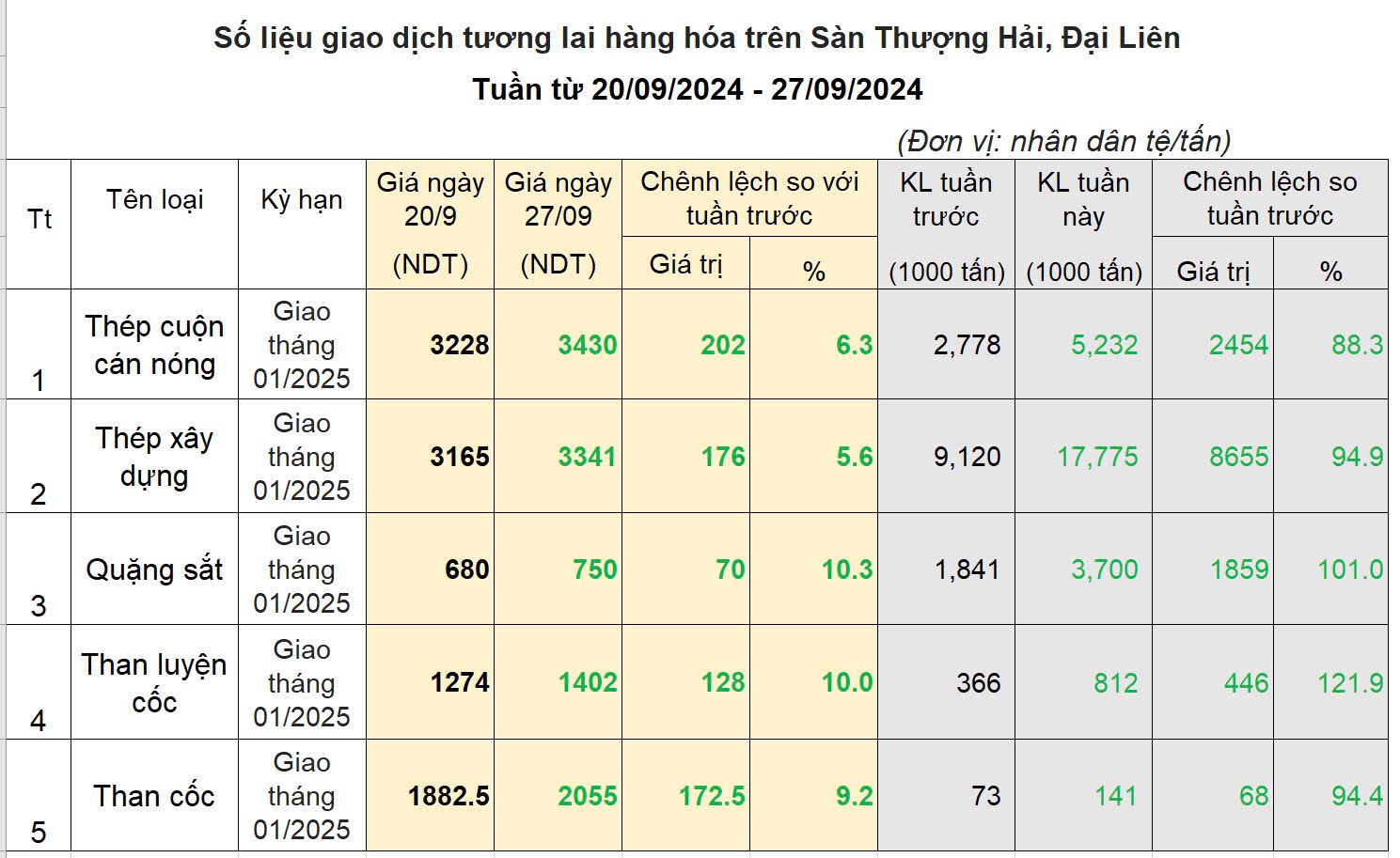 Ngày 26/9/2024, Bộ Chính trị Trung Quốc đã có kỳ họp bất thường, xem xét và thông qua một loạt chính sách kích thích tăng trưởng kinh tế: Hạ lãi suất cơ bản, bãi bỏ các quy định hạn chế mua/sở hữu nhà, bơm tiền trực tiếp cho một bộ phận dân cư… Đây có thể nói là một loạt các chính sách kích thích mang tính đồng bộ cao và chưa có tiền lệ. Các thị trường tài chính, hàng hóa ngay lập tức phản ứng rất tích cực và đồng loạt bật tăng mạnh mẽ. Kết thúc tuần giao dịch, giá thép tăng trên 6%, quặng sắt và than tăng 10%. Khối lượng giao dịch cũng có sự sôi động khi tăng trưởng gần 100% so với tuần trước.