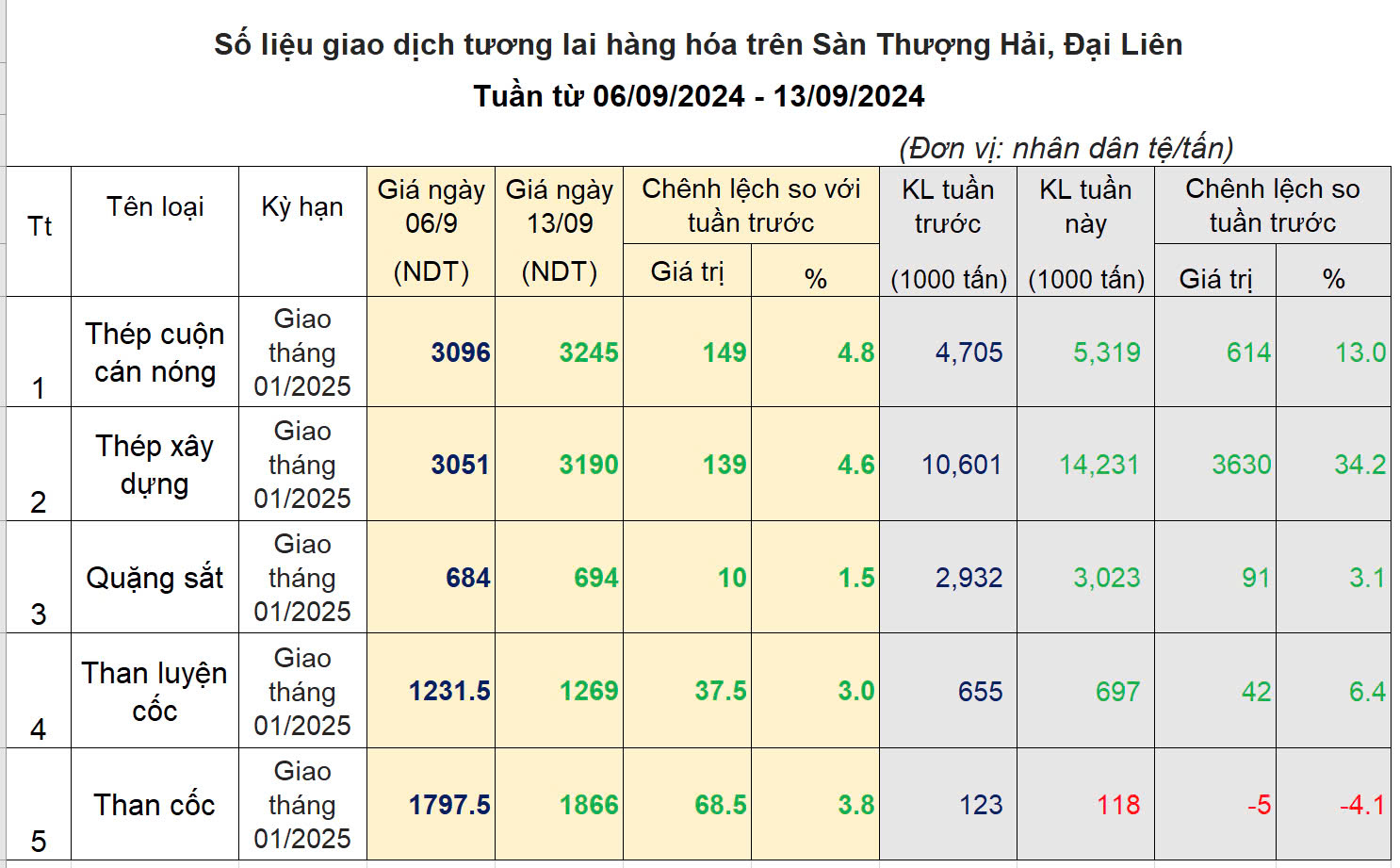 Thị trường giao dịch hàng hóa vừa trải qua tuần giao dịch biến động rất mạnh. Vào phiên đầu tuần, giá HRC giảm mạnh, có thời điểm xuống 3037 NDT. Các phiên tiếp theo giá thép hồi phục ấn tượng có thời điểm giá lên chạm mức 3276 NDT, biên độ giao động lên tới 240 NDT/tấn. Chốt phiên cuối tuần, giá thép tăng bình quân 4.7%, quặng sắt tăng 1.5%, than tăng trên 3%. Thị trường giao dịch sôi động khi khối lượng mua/bán tăng khá. Đáng chú ý là mặt hàng thép cây, lượng giao dịch tăng 34% so với tuần trước, đây cũng là mức thanh khoản cao nhất tính từ tháng 11/2020.