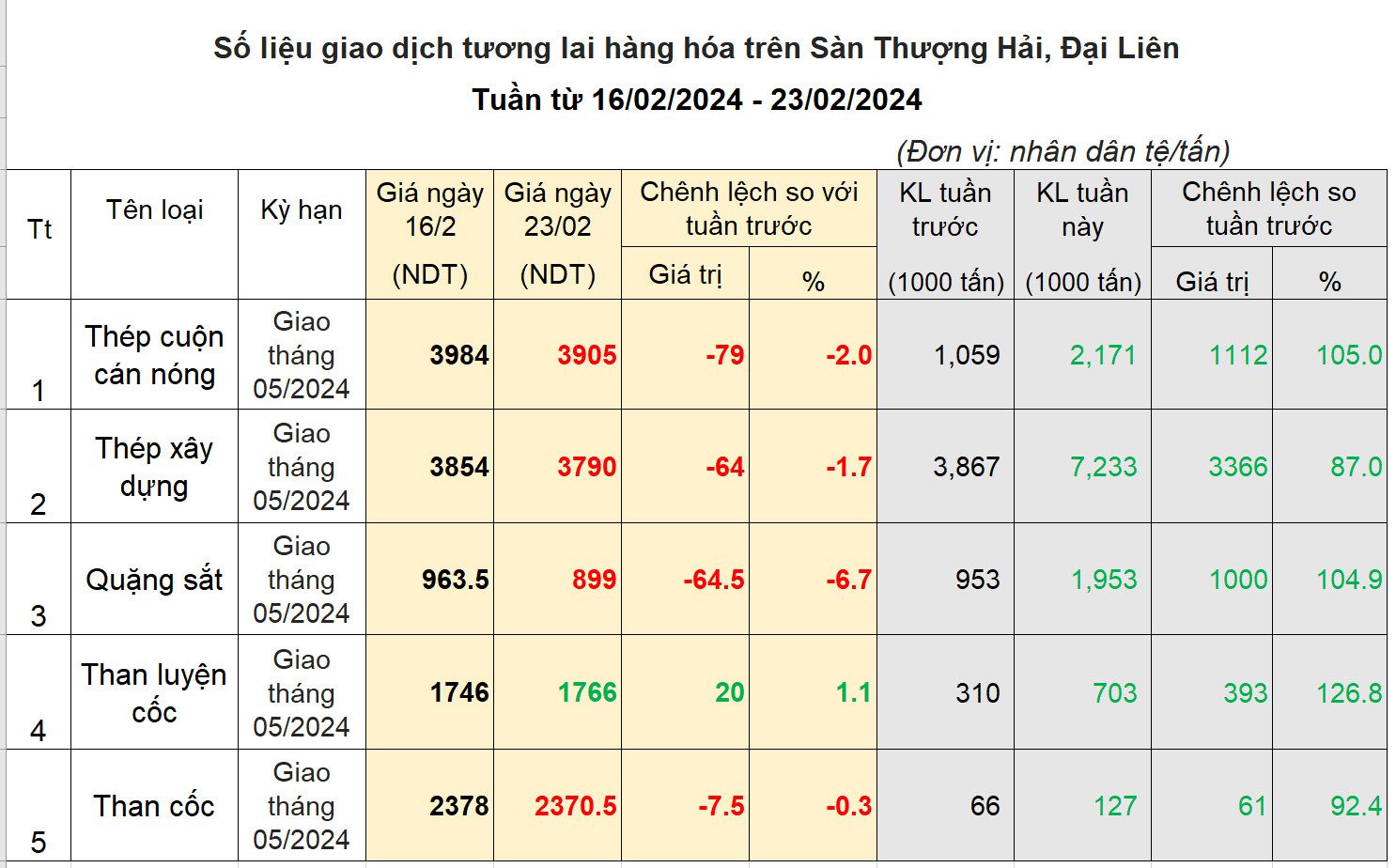 Tăng trưởng kinh tế chậm chập, tồn kho tăng mạnh đã khiến giới đầu tư lo ngại. Ngay trong phiên mở cửa đầu năm mới, dù đã có chút hưng phấn đầu giờ sáng nhưng đến cuối ngày các chỉ số giá hàng hóa đều giảm mạnh. Đà giảm mạnh còn còn nối tiếp sang hết phiên hôm sau. Chỉ sau khi Chính phủ Trung Quốc ra quyết định hạ lãi suất cho vay cơ bản 5 năm từ 4.2% xuống 3.95% vào cuối ngày 20/2, đà giảm giá mới chững lại và nhích lên nhẹ vào cuối tuần. Việc hạ mạnh lãi suất được cho là động thái quyết tâm vực dậy thị trường bất động sản của Trung Quốc. Giới đầu tư kỳ vọng sẽ còn nhiều chính sách kích thích/nới lỏng trong năm 2024. Chốt tuần, gíá thép giảm gần 2%, giá quặng sắt giảm trên 6%, chỉ có giá than tăng nhẹ 1%.