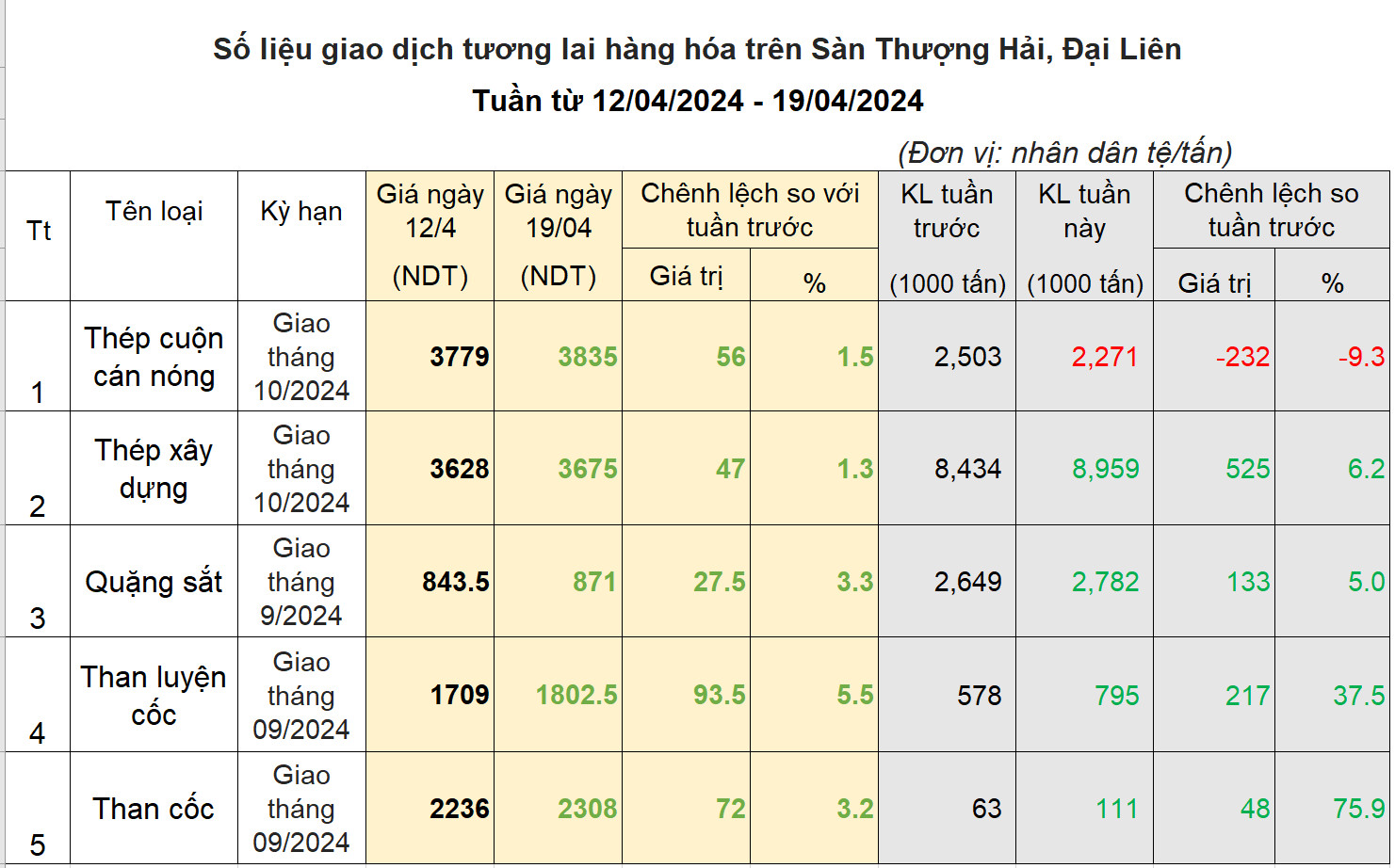 Tuần này, thị trường thép đón nhận nhiều thông tin tích cực. Sản lượng quặng sắt và thép tăng, tồn kho giảm đáng kể. Lợi nhuận của các nhà sản xuất tăng khi giá nguyên liệu thô ở mức thấp và giá thành phẩm hồi phục. Đặc biệt, cuối ngày thứ ba Trung Quốc đưa tin tăng trưởng GDP quý 1 tăng 5.3%, vượt mọi dự báo của các chyên gia, Đà tăng trưởng GDP được thúc đẩy từ sản xuất công nghiệp với mức tăng 6.1%, giá thép đã tăng khá mạnh ngay sau thông tin này. Chốt tuần, giá thép tăng bình quân 1.4% , quặng sắt tăng trên 3% và than tăng 4%.